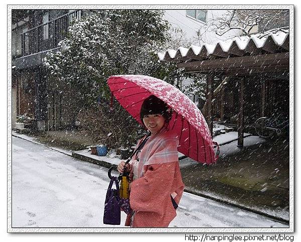 由於外頭下著雪,除了外衣,店家也準備了有透明雨套的夾腳鞋,就像是夾腳鞋上穿了一件透明雨衣,很貼心方便,還可以順便擋風,所以走在路上也全然不會冷。另外還有搭配和服的雨傘,從頭到腳都很有整體感~~~