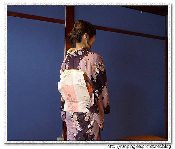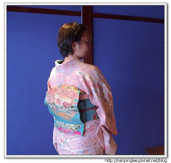 不過選和服的過程中,因為和服花樣實在很多,要從中挑出一件,實在很不容易。很湊巧的,我突然看到一件顏色比較鮮明的紫色和服,心裡想著小瑾一定很喜歡這件,就幾乎不太作考慮的選中它。至於腰帶,老闆娘表示,只要腰帶上的其中一種顏色與和服上的某一顏色差不多,就可以挑選,由於我的和服上有粉色小花,所以腰帶就選了比較素的粉色。同樣挑選粉色和服的友人姊妹,也根據和服上的顏色來選擇腰帶。