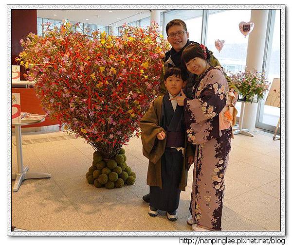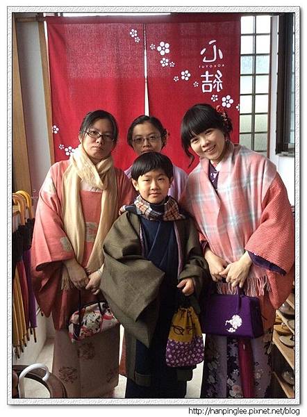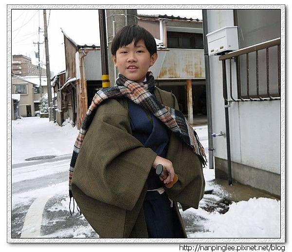 話說當天的溫度最高是0度,事前為了抗寒,我們準備了貼式暖暖包,穿著和服時也詢問可否使用,老闆娘告訴我們,貼在背後腰部的作用會比較好,著裝時也幫我們貼得好好的。加上和服綁得緊,又很多層,老實說,在外頭走動時,除了手、臉會比較冰涼外,我完全沒有感到寒冷。只是小瑾的男孩和服比較少層,加上並沒有綁很緊(其實原本綁得挺緊,只是小瑾不習慣,感覺不舒服,因此後來中文翻譯有幫忙「鬆綁」一些),所以大概風灌得進去,即使用了自己的圍巾和手套,也一直喊冷,算是這次體驗的小遺憾。