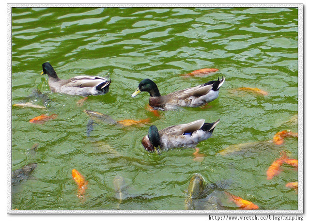鴨子居然跑來跟魚搶飼料(至少不是搶吃魚...)
