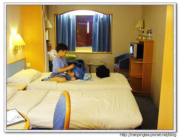 房間沒有view,因為被救生艇給擋住了,所以房型叫做「方窗海景房間(視野受阻)」,