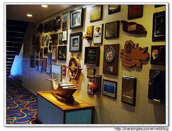 十一樓電梯間有一面牆都是獎牌,還有一個船化身成鯨魚的木雕。